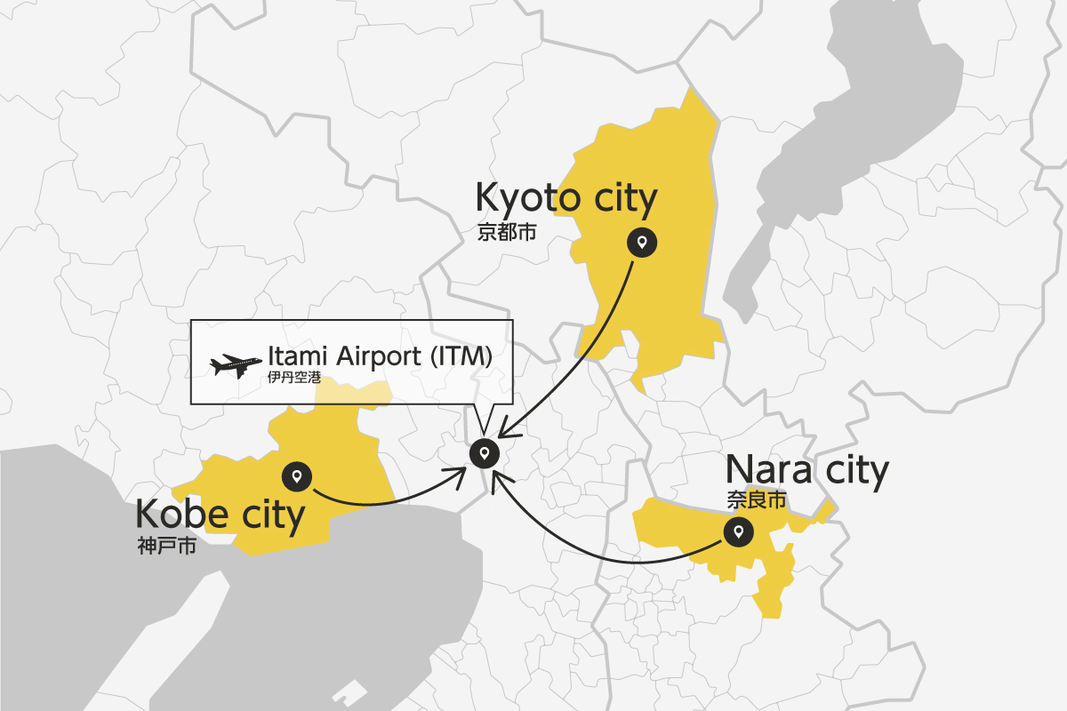 Itami Airport, the largest domestic airport in Kansai, is just a 30-40 minute drive from downtown Osaka. It offers easy access to major cities like Tokyo and Fukuoka, making it a convenient choice for travel. We offer transfers between Itami Airport and key Kansai cities like Osaka, Kyoto, Nara, and Kobe.